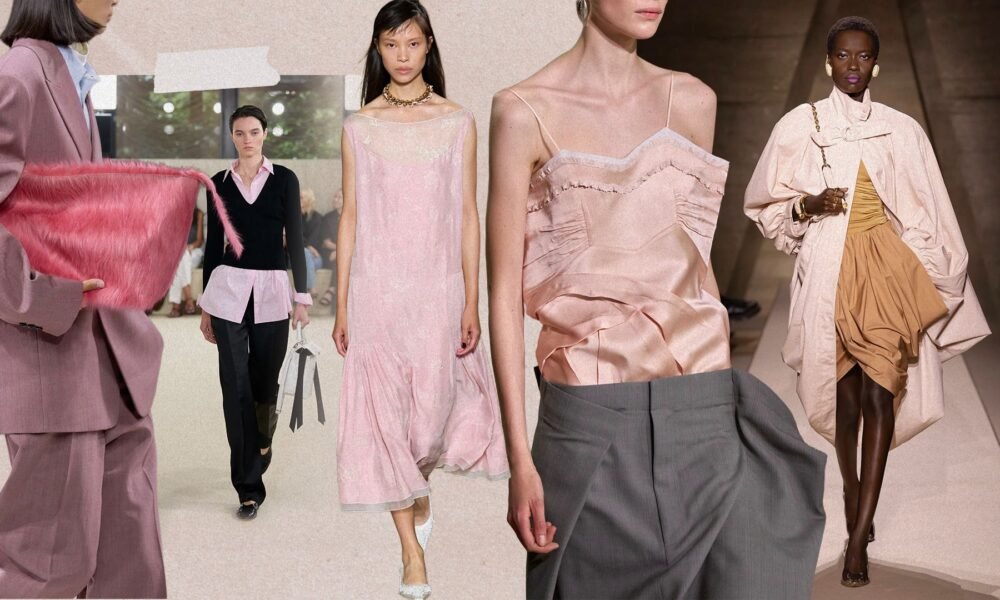 This spring, it’s all about looking pretty in pink. Blush pink is making a subtle comeback from the peak of the Barbiecore trend, re-entering the spotlight with a fresher, more grounded vibe. As romantic silhouettes keep building momentum season by season, spring/summer 2026 shows that pink is no longer limited to overtly feminine styles. Rather, it shows up in practical, wearable styles meant to integrate into daily outfits. At Totême and Bottega Veneta, the color appeared via refined layering: crisp shirts visible under black cardigans or paired atop silky draped tops, creating a deliberate textural contrast. At Chloé, Chemena Kamali reenvisioned practical outerwear in a gentle blush shade, accented by a bow that lent it a soft, contemporary vibe. The message was unmistakable: pink is no longer just girlish—it’s evolved into something much more sophisticated. For many, pink carries associations with youth. This season, however, designers have repositioned it as a hue for the contemporary woman—gentle, confident, and remarkably adaptable. It seamlessly pairs with the essentials of everyday outfits, enhancing everything from classic neutrals to soft pastels and even vibrant bursts of color (red!).