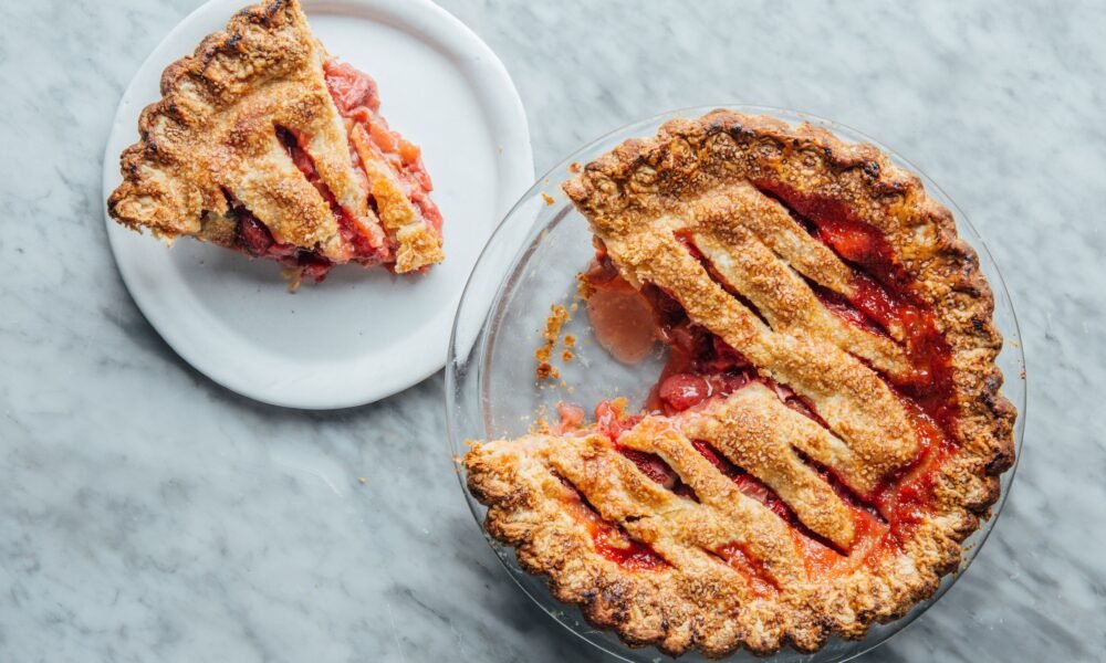 ​Dough. Step 1. Whisk 3½ cups (438 g) all-purpose flour, 2 Tbsp. granulated sugar, and 1½ tsp. Diamond Crystal or 1 tsp. Morton kosher salt in a large bowl to combine. Add 1½ cups (3 sticks) chilled unsalted butter, cut into pieces, and toss with your fingers to evenly coat. Working quickly and aggressively, smash and rub butter into dry ingredients to create large, shaggy pieces (you want some pieces that are flat and thin and some that are large and irregular).. Step 2. Stir ¼ cup chilled vodka (if using), 2 Tbsp. apple cider vinegar, and ¼ cup ice water (or ½ cup ice water if not using vodka) in a small bowl. Drizzle over butter mixture, then mix with a fork until shaggy pieces form. Knead in bowl with your hands a couple of times until a shaggy dough forms (it will look quite dry). Transfer large clumps of dough to a surface. Drizzle 1 Tbsp. ice water over remaining dough in bowl and knead again just to bring it together. Add to dough on surface.. Step 3. Divide dough in half. Working with 1 half, press into a single mass, incorporating dry bits, then pat down to make a ¾”-thick block. Using a bench scraper or knife, divide into 4 pieces. Stack pieces, tucking any unincorporated dry bits in between layers, and press down to flatten and combine. Pat into a ¾”-thick disk and wrap tightly in plastic. Using your fingers and the outside edges of your palms, press in any rough spots or remaining dry bits of dough. Repeat process with remaining dough. Chill disks at least 2 hours (but preferably go at least 12 hours).. Do Ahead: Dough can be made 5 days ahead. Keep chilled, or freeze up to 1 month.. Filling and Assembly. Step 4. Preheat oven to 425°. Let dough sit at room temperature 5 minutes to soften. Working one at a time, roll out disks on a surface lightly dusted with all-purpose flour to ⅛” thick. Place each on a parchment-lined rimmed baking sheet and chill while you prepare the filling.. Step 5. Scrape seeds from 1 vanilla bean, split lengthwise, into a large bowl (or add 1 tsp. vanilla extract); reserve pod for another use. Add 1¼ lb. rhubarb, cut into ½” pieces, 1 lb. strawberries, hulled, halved, quartered if large, ½ cup (100 g) granulated sugar, ⅓ cup (packed; 67 g) light brown sugar, ¼ cup plus 1 Tbsp. cornstarch, 1 tsp. finely grated lemon zest, and a pinch of kosher salt; toss to coat.. Step 6. Carefully transfer 1 dough round to pie dish (using a deep pie dish is critical here). Lift up edges and allow dough to slump down into dish (if it’s too cold to be pliable, let it warm up slightly first). Gently press dough into edges of dish if needed. Trim, leaving about a 1″ overhang. Gently scrape in filling and smooth top. Lay remaining dough round over filling and trim, leaving about a ½” overhang. Fold edge of bottom round up and over top crust; press together to seal and crimp as desired.. Step 7. Beat 1 large egg with 1 tsp. water in a small bowl and lightly brush over crust. Sprinkle with 1 Tbsp. raw or granulate