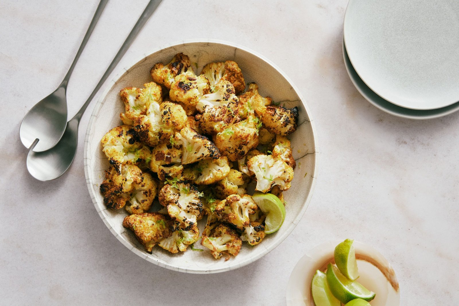 ​Taking inspiration from the Northern Indian dish gobi tikka, this yogurt-based marinade tenderizes and gives deep, bold flavor to roasted cauliflower. Flavored with fresh garlic, ginger, and warm spices like garam masala and Kashmiri chile powder, the yogurt coats every nook and cranny of the vegetables, helping each floret develop beautiful caramelization.. Cook the cauliflower at a moderately high temperature so that it adequately softens while developing color. A quick blast under the broiler adds extra char, while a finishing squeeze of lime brightens the heady spice.. What is “tandoori-style”?. Tandoori dishes are traditionally cooked in a tandoor, a hot clay oven popular in Indian and other South Asian cooking. The term “tandoori-style” typically refers to foods coated in yogurt and spices, then roasted or grilled until lightly charred.. Can I use regular yogurt instead of Greek?. Greek yogurt has a thick texture that coats the florets. If using regular yogurt, strain it in a fine-mesh sieve or cheesecloth for about 30 minutes to remove excess liquid.. How hot is Kashmiri chile powder?. Kashmiri chile powder adds very mild heat and a vibrant red color. Substitute with paprika (not smoked) if preferred.. How do I get deeper browning?. If the cauliflower is tender but you want more char, switch the oven to broil for 1–2 minutes at the end. Keep a close eye on it so the yogurt coating doesn’t burn.. Can I marinate the cauliflower ahead of time?. Yes. Toss the cauliflower with the yogurt mixture up to 8 hours ahead, cover, and refrigerate. Let it sit at room temperature while the oven heats, then roast as directed.