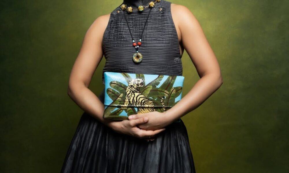 Bhumi Pednekkar’s Dulari look is organised around the skirt. A sleeveless high-neck top in charcoal sets a contained upper line, but the eye drops quickly to the handwoven mulberry silk balloon skirt. Its volume is gathered low and wide, with a rounded hem that gives it that buoyant shape, while the hand-painted surface shifts across the fabric in smoky tonal variations. Hand-embroidered highlights catch light in small flashes, which keeps the surface active as the skirt moves.. The top stays pared back and close to the body. The skirt brings volume, texture and a surface that changes as the folds deepen and release. A broad waistband makes that division explicit, so the silhouette feels intentionally split.. Bidipto’s styling works with that divide. Jewellery by Lotus Arts de Vivre sits high at the neck and then drops lower through the pendant, creating a vertical line before the eye meets the fuller sweep of the skirt. The earrings bring in turquoise and pearl, breaking the darker palette with a brighter note of colour. The hand-held bag, with its painted tiger and palm motif, adds a playful note to the ensemble.. Hair by Jyoti Mandre is pulled into a tight bun and tied at the back with a gold ribbon, a detail that shows itself more clearly in profile and from behind. At the hem, the embellished Aprajita Toor heels add another glinting surface when the skirt lifts. The makeup stays in a darker evening direction, with smoked eyes, a low-sheen base and a deeper rose-brown lip.. “The accessories overshadow the simple but statement charcoal grey ensemble. Ditch them for a more minimal chic approach. Pair with thonged sandals, a statement watch, small studs and an east-west shoulder bag,” says Divya Balakrishnan, Vogue India fashion associate.