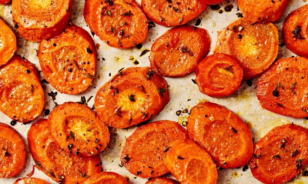 These roasted carrots couldn’t be easier—or more delicious. Toss sliced whole carrots (never baby carrots!) with olive oil, fresh herbs, salt, and pepper, then pop the tray in the oven. Yes, that’s it. The oblong coins turn tender and caramelized, slightly crisping at the edges. Using multicolored carrots makes this side dish extra pretty, but even a colossal bag of regular ol’ orange carrots will shine. Top the roasted carrots with a little lemon zest, more herbs, or a drizzle of honey for a simple upgrade that will make everyone ask for seconds.. Tips for the best roasted carrots. Do I have to peel carrots before roasting? Young carrots can be roasted with their skins on; older carrots can benefit from peeling, but it isn’t totally necessary. Just be sure to give unpeeled carrots a good scrub—remember, they grow underground and can hold on to quite a bit of dirt.. Skip the parchment: Avoid lining your pan with parchment or silicone when roasting. Deep caramelization comes from direct contact with the metal, and liners can get in the way.. Even slices matter: Cutting the carrots into uniform pieces is the best way to ensure the entire tray cooks at the same rate. We like to slice on the bias (into diagonal coins) to increase the surface area of each disk and encourage the most caramelization.. Flavor variations: Think of these roasted carrots as a blank canvas. Feel free to skip the herbs, or pair them with ground cumin, ginger, garlic powder, or any of your favorite spices (about 1 tsp.). Spice blends such as baharat, garam masala, five-spice powder, or chili powder work well too, especially with a pinch of brown sugar.. Serving suggestions: Spoon the roasted carrots over a dish of whipped ricotta and garnish with a drizzle of honey, pomegranate molasses, or simple vinaigrette, plus more chopped fresh herbs, such as parsley, dill, or cilantro. Or simply finish with a squeeze of lemon juice and an extra drizzle of olive oil.