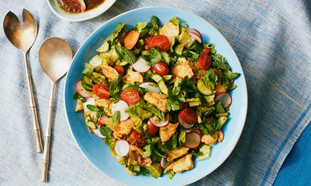 Fattoush, a juicy, crunchy mix of fresh herbs, cucumbers, tomatoes, and toasted pita, is one of the most famous Levantine salads. This version, adapted from Mario Jr. Haddad of the popular Lebanese café Al Falamanki, blends regional variations into a cohesive whole. Adding garlic reflects traditional recipes from Lebanon’s mountainous regions, while pomegranate molasses (a popular addition in Syria), gives depth and robust sweetness to the zingy sumac dressing.. It’s an excellent use for day-old pita: tear it into pieces, drizzle with olive oil, and bake until golden so it stays crisp even after tossing with the dressing (or swap in lightly crushed pita chips). While you can make this fattoush year-round, it shines in summer when tomatoes are at their sweetest. Serve it alongside grilled chicken, steak, or fish—or let it anchor a light, herbaceous dinner on its own.. What, exactly is fattoush? Fattoush is a chopped vegetable salad built around toasted or fried pita. Its name translates to “crumbled,” referring to the crunchy bread pieces. Sumac—mixed into the dressing or sprinkled over the assembled salad—is the defining spice of traditional fattoush and lends the dish its signature tang. Soaking the spice in warm water extracts maximum flavor.. Is pomegranate molasses essential? This ingredient adds and extra layer of sweet-tart flavor to the dressing. If you don’t have it, make your own by simmering pomegranate juice until syrupy, or substitute with saba or aged balsamic vinegar—the flavor won’t be identical, but they provide similar balance.. How do I keep the pita crunchy? Bake until deeply golden and crisp—you can take it further than you think. Don’t overdress the salad; toss with about a third of the dressing, then add more as needed and serve the rest on the side.. Can I make fattoush in advance? You can prep all the elements up to a day ahead, but toss everything together—especially the pita—just before serving for the best texture.. Swaps and additions: Radishes add peppery bite, but you can substitute thinly sliced red onion or other crunchy vegetables like bell peppers. For the herbs, you can use just parsley, just mint, or a combination of the two alongside other herbs like dill or cilantro.