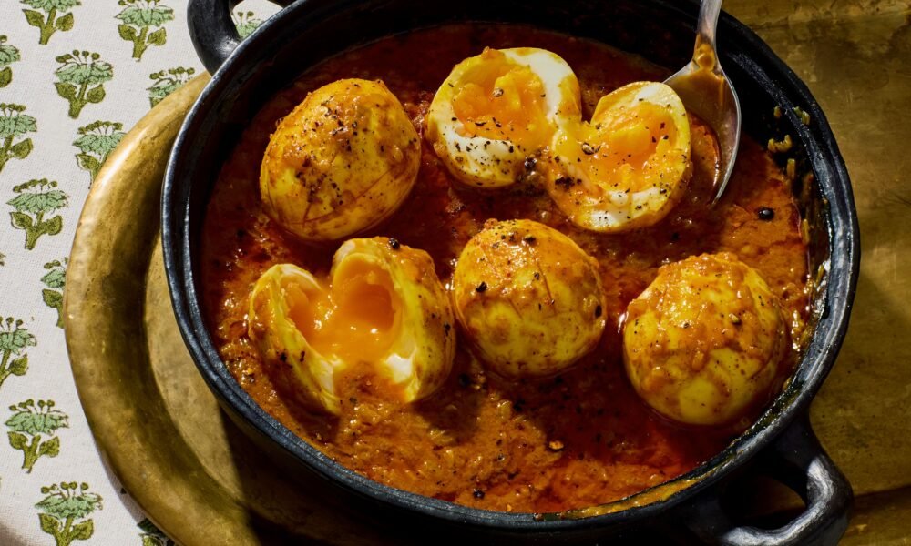 Step 1. Bring a large pot of water to a boil over high heat. Gently add 8 large eggs and boil for 7 minutes, then, using a slotted spoon, transfer them to an ice bath to cool while you make the sauce.. Step 2. To prepare the sauce, heat 3 Tbsp. virgin coconut oil in a large skillet over medium heat. Add 2 tsp. coriander seeds, lightly crushed, and cook, stirring frequently, until they turn light golden, 30–45 seconds. Add 4 large shallots (about ⅔ lb./300 g), finely diced, and 1⁄2 tsp. fine sea salt to the skillet and cook, stirring occasionally, until the shallots soften and turn light golden, 7–11 minutes. Stir in 1 Tbsp. Byadgi chilli powder, 1 tsp. ground turmeric, ¼ tsp. freshly ground black pepper, and 1⁄2 cup (120 ml) water and cook until the water evaporates, 4 to 7 minutes.. Step 3. Stir in one 14-oz. (398-ml) can full-fat coconut milk and the remaining 1 tsp. fine sea salt. Reduce the heat to medium-low, partially cover, and simmer until the sauce is reduced by a quarter and the oil is starting to separate, 9 to 12 minutes.. Step 4. Meanwhile, peel the eggs and score the whites of the eggs lengthwise about 5 times around each egg, being careful not to cut too deep and hit the yolk. (This will help the sauce permeate the egg.). Step 5. Gently add the scored eggs to the skillet and continue to cook, gently basting and turning the eggs over in the curry until the outsides of the eggs start to take on the color of the sauce and are heated through, 4–6 minutes.. Step 6. To finish, stir in juice of 1⁄2 lemon, (1–2 Tbsp.). Taste and season with more salt and/or lemon juice, if necessary.