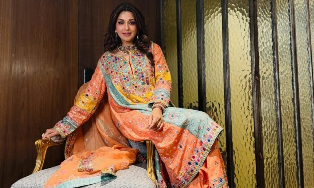 When Sonali Bendre arrived at filmmaker Sooraj Barjatya’s daughter’s wedding reception, she set the tone for the summer with a vibrant kurta set. Dressed in a colourful ensemble by Abu Jani Sandeep Khosla, the actor embraced a vibrant palette that brought together craft and comfort.. Featuring a straight, pheran-style kurta, the actor’s look is composed of striking multi-coloured panels in shades of orange, aquamarine and yellow. It was rounded off with coordinated palazzo pants and an airy orange dupatta. The interplay of colour blocking and traditional craft lent the outfit a bohemian spirit, yet its tailored structure ensured it remained Reception-ready.. According to Abu Jani and Sandeep Khosla, the set belongs to their ‘Banjara’ repertoire, a line that celebrates nomadic craft traditions through contemporary silhouettes. “Sonali Bendre is a joyous vision in Banjara by Abu Sandeep,” the designer duo shared. “The freshest peach, blue and yellow pastel hues come alive to create the perfect sartorial welcome to spring. The patchwork kali kurta, crafted in silk, features multicolour resham embroidery punctuated with mirror work.” The designers also note that the piece draws inspiration from their vintage’ Rabadi’ collection, translating heritage techniques into a modern context. The result is what they describe as “bohemian grace reinvented for the 21st century woman, where craft, art and attitude converge in spirited harmony.” A memoni and organza dupatta adds a wispy contrast to the rich fabric and intricate embroidered surface of the kurta.. Bendre styled the look with a sculptural gold choker with matching drop earrings and stacked kadas. Metallic stilettos and a clutch served as the finishing touches. For glam, she went with a matte base and smoky eyes in shades of burnt orange that complemented the palette of the outfit, along with a nude pink lipstick.