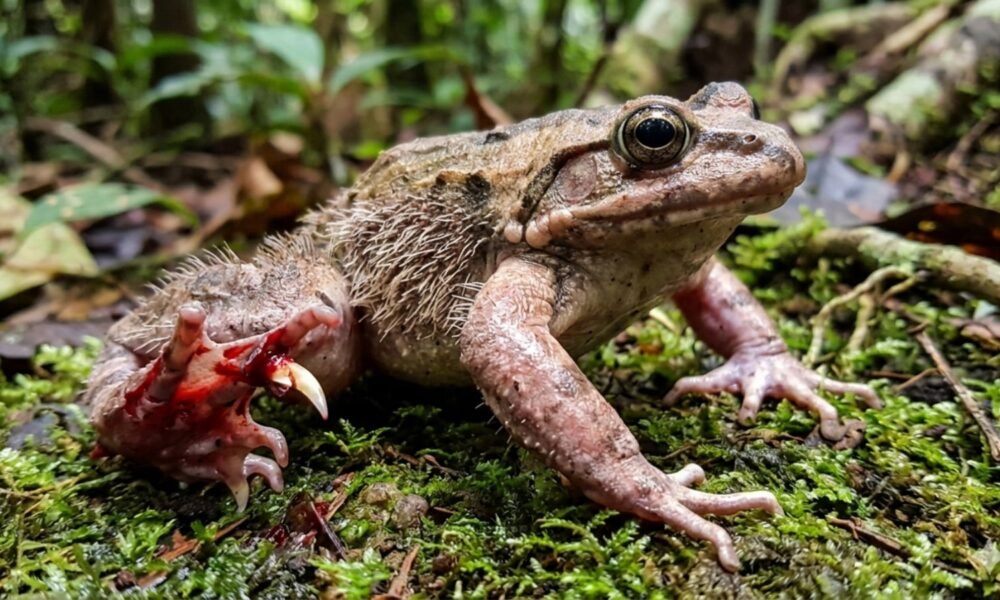 In response to threats, they fracture their own toe bones to form these claws, which can subsequently retract and heal (Image: Gemini). Nature teems with odd survival strategies, yet certain ones are so outlandish they seem almost implausible. One such animal is a frog that literally breaks its own bones for self-defense. Meet the hairy frog, a species native to Central Africa with one of the animal kingdom’s most bizarre defense mechanisms. It appears to be an ordinary amphibian at first glance, but its response to threats distinguishes it in a truly astonishing manner—a defense mechanism unlike any other. The hairy frog is commonly known as the ‘Wolverine frog’ (Image: Wikimedia Commons). In contrast to most frogs that depend on camouflage or swift getaways, the hairy frog opts for a much more extreme strategy. When under threat, it intentionally fractures the bones in its toes. These bones then pierce the skin, creating sharp, claw-like protrusions that serve as defenses against predators. Even more intriguing, these claws are not permanent.