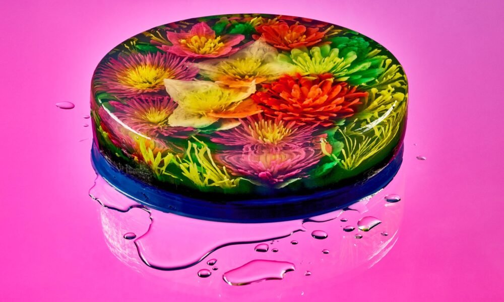 Patience is key for making impressive jelly desserts. That’s something Thu Buser, a Brooklyn-based chef and culinary artist, learned at an early age while watching her mother spend hours preparing batches of rau câu, a Vietnamese dessert featuring delicate, colorful jelly layers. Now Buser creates her own highly stylized jellied desserts, multicolored variations on the rau câu she enjoyed growing up. She injects fruit juices into pristine clear jelly, producing bursts of color and flavor: a kaleidoscope of vibrant green coconut-pandan, a sunset-hued yellow yuzu-lychee, a riotous fuchsia coconut-ube. “Buser says, ‘I can make any flavor pretty.'” Her syringe serves as her paintbrush, applying delicate sweeps and precise staccato jabs to the cooling agar-based gelatin. This is all done essentially blindly, as the injections are performed from the bottom of the mold.