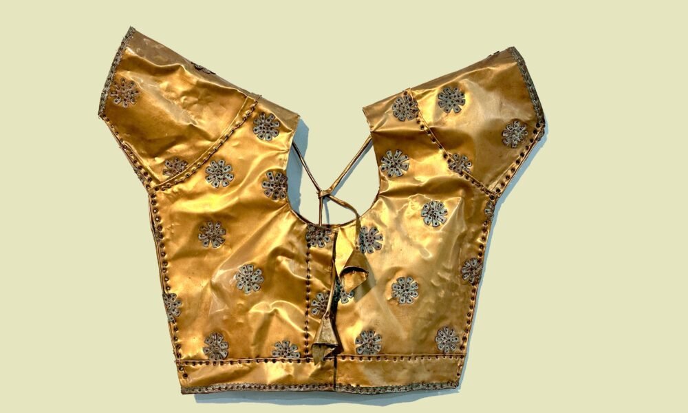 As the pressure from her family mounted, so, too, did her systems of support. Arya connected with fellow artist Deepak Kumar—now her partner—and moved with him to Kaladham, where she could pay subsidised rent and focus on securing her master’s degree. When the pandemic upended any hope of a final-year showcase at the College of Art, Delhi, she took it upon herself to apply for every open call she could find, eventually securing a solo show alongside a ₹30,000 grant by the Raza Foundation. More shows and residencies followed, including a spot in Somaiya Vidyavihar University’s Immerse fellowship in Mumbai and the Khoj Peers and Serendipity Arts residencies, both in Delhi.. She may have wriggled free of the ties that once bound her to tradition, but the artist from Haryana has never forgotten her roots or taken for granted that her story is not as common as it should be. Through her practice, Arya remains committed to championing the women artisans who’ve inspired her and bringing their stories to fast fashion–consuming urbanites who need to hear them: the neighbouring city of Panipat has become infamous as the cast-off capital of the world, with over 20,000 recycling units processing over a million tonnes of textile waste annually and releasing uncountable air and water toxins in the process. The artist often calls in favours from friends of friends to document the stories of the women working in these factories, many of whom are forced to not only breathe toxic levels of fabric particles every day and constantly cut themselves on the rudimentary tools given to them, but also bring their children to work and expose them to the pollution due to a lack of childcare facilities in the area. “They tell me, ‘Yeh kaam bali maangta hai’ (This work demands blood),” said Arya, showing me her studio walls in Kaladham that are now lined with photographs she has taken during her site visits.