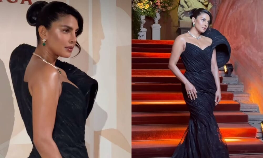 Priyanka Chopra completed her look with statement pieces from Bvlgari’s Eclettica high jewellery collection (Image source: @priyankachopra/Instagram). Priyanka Chopra Jonas recently made heads turn at Bvlgari’s Eclettica High-End Collection in Milan in a jet-black gown. Known for her sartorial style, The Bluff actor stunned at the event in a tulle gown by Saiid Kobeisy.. The black gown featured pleats, wrapped diagonally around the bodice, that highlighted her waist. Styled by Wayman Bannerman and Micah McDonald, the structured gown flowed into a flared skirt with a soft trail. Its asymmetric neckline revealed one shoulder, while the other side rose into a sculptural pleated detail.. The global star completed her look with statement pieces from the high jewellery collection, including a diamond necklace set with emeralds, matching earrings, and a ring that added a pop of colour.. For hair, she opted for a sleek updo with a soft curl hanging down her right cheek. Makeup artist Morgane Martini kept her look warm and defined, finishing with a glossy nude lip.. Priyanka shared a video on Instagram, giving a glimpse of her starry night and photoshoot. She can be seen striking poses in front of the camera, her smile complementing her dewy makeup.. Watch here:. View this post on Instagram. Also Read | Oscars 2026: Priyanka Chopra Jonas returns as presenter, makes a sleek style statement in white. Priyanka joined Bvlgari as the brand ambassador in August 2021, making her the only Indian ambassador for the Italian luxury label.. The event also saw Anne Hathaway, Dua Lipa and Jake Gyllenhaal grab attention with their striking looks. Hathaway, a global ambassador for the brand, opted for a V-neck ball gown with cape sleeves. She styled her hair in a messy high ponytail, allowing her Bvlgari jewellery to remain the focus.. Dua Lipa wore a bold, deep-V-neck gown with a thigh-high slit, paired with sheer black stockings. She kept her hair loose, letting the jewellery shine through the overall glamorous look. Kim Ji-won wore a blue strapless gown with gathered detailing at the waist and a flared hem. She completed her look with straight hair, soft pink makeup, and held a black clutch.. Story continues below this ad. Liu Yifei brought high-fashion drama in a brown gown with a plunging neckline and tassel details. She styled her hair with braided sections in the front, tied into a neat bun. Jake Gyllenhaal kept it classic in a black tuxedo, adding a unique touch with an eye-shaped diamond brooch and a Bvlgari watch.. 📣 For more lifestyle news, click here to join our WhatsApp Channel and also follow us on Instagram. © IE Online Media Services Pvt Ltd